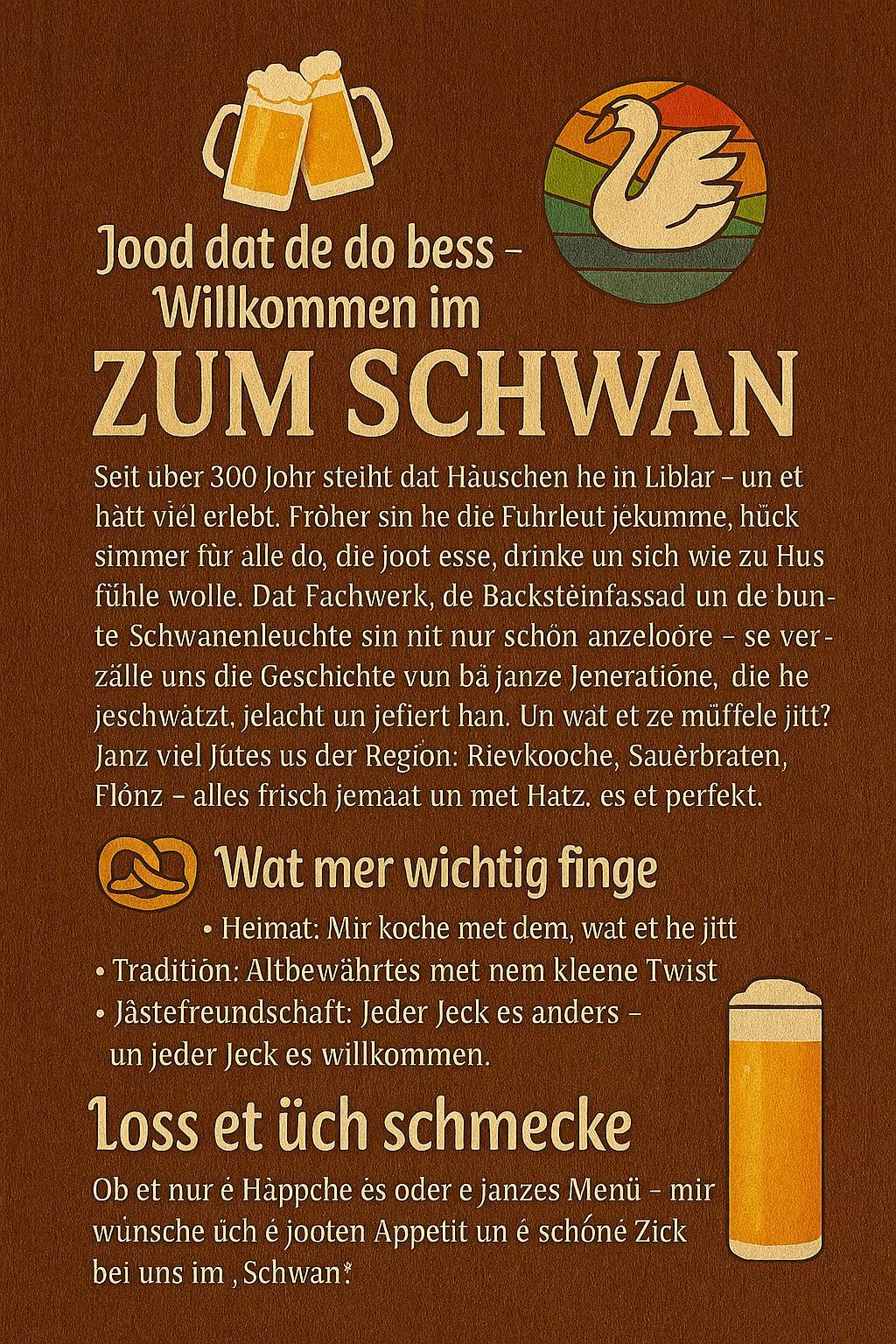 Genießen Sie die angenehme Atmosphäre unseres Hauses, das für seine Gastfreundschaft und den warmen Service bekannt ist. Im Zum Schwan sollen Sie sich nicht nur satt, sondern rundum wohlfühlen.